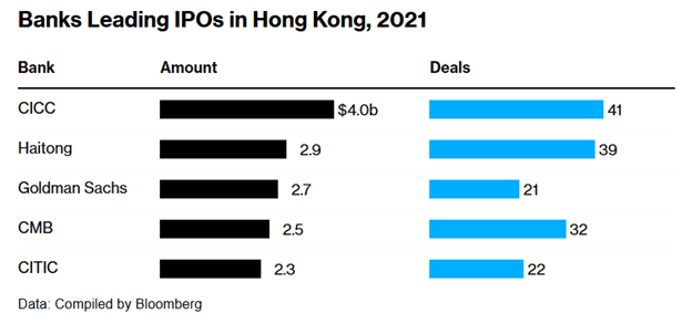 Wall Street has long eyed China as the last great moneymaking frontier, and 2021 was supposed to be the year companies’ vast investments would start to bear fruit. Foreign banks had just been given the right to take full control of their joint ventures and set up their own asset management businesses. But before the year even began, Beijing scrapped Ant Group Co.’s $35 billion initial public offering at the last minute, depriving firms including JPMorgan and Citigroup of almost $400 million in fees. Then a regulatory squeeze on sectors from technology to education and property curbed demand for IPOs.